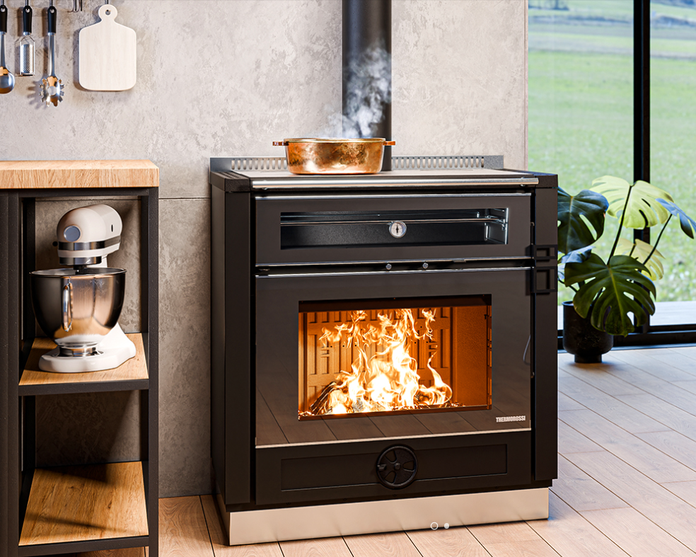 Cucina a legna da incasso o libera installazione, forno smaltato in ghisa panoramico ed ergonomico perché situato sopra la camera di combustione. In questo modo si garantisce facile accesso, temperature elevate, facilità di pulizia e manutenzione. Piano superiore in ghisa levigata a temperatura differenziata. Incredibilmente versatile grazie a 4 zone di cottura diversificate: 1- Piano cottura posteriore in ghisa satinata completo di dischi (200-280 °C), 2- Piano cottura anteriore in ghisa satinata (180-230 °C), 3- Piano cottura incassato in ghisa smaltata completo di cerchi, ad altissima temperatura (300-460 °C). 4- Forno smaltato con porta frontale, dotato di comando per regolare la temperatura e la ventilazione naturale al forno. Brevetto Scrigno® Thermorossi: basta un semplice gesto per scoprire un piano cottura ad alta temperatura, per gratinare, arrostire o semplicemente cuocere più velocemente (funzione booster) e un forno con porta di accesso frontale, termometro e comando per ventilazione naturale.