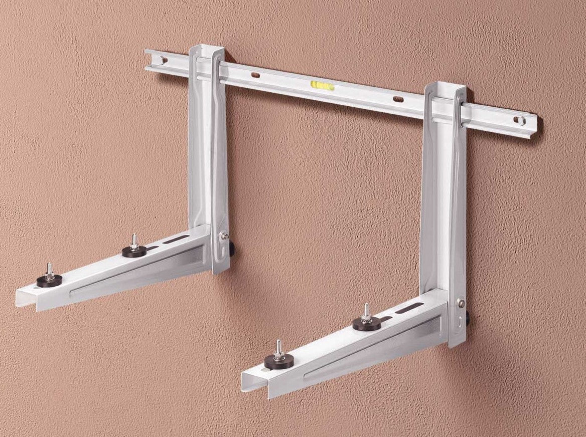 Staffa scorrevole in acciaio elettro zincato per uso domestico con sistema di livellamento; confezionato in scatola completo di accessori per l’installazione e il fissaggio per unità esterne di condizionamento mono e multisplit e pompe di calore