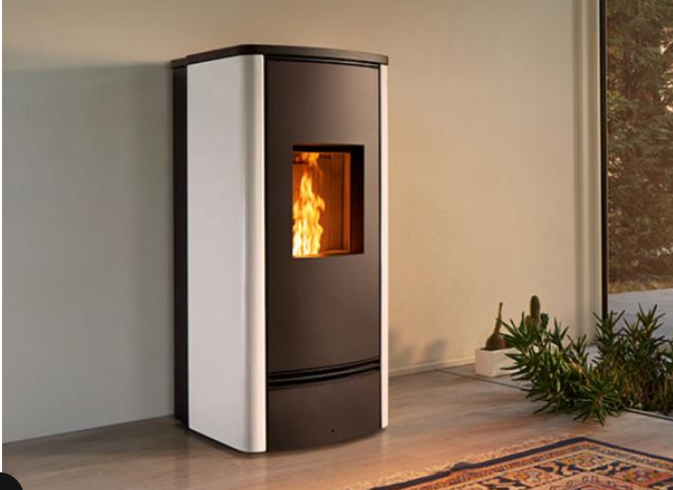Stufa a Pellet modello P920 M STEEL con rivestimento in Acciaio, installabile a Parete Filomuro - Angolo, Classe di Efficienza Energetica A+. Dispone di Multifuoco® System.