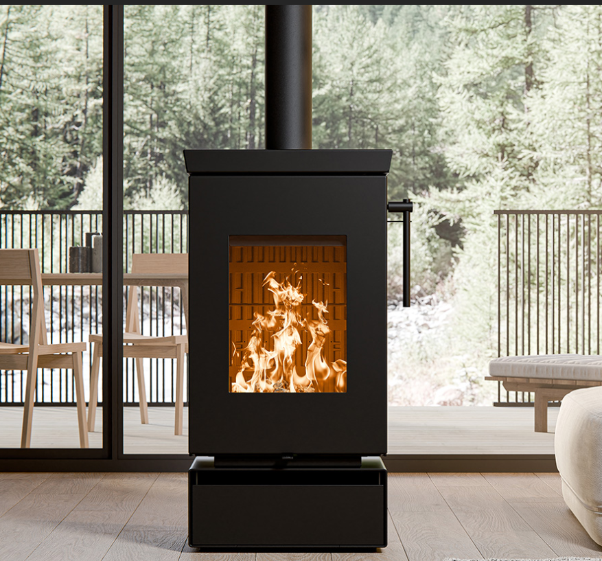 Stufa a legna salvaspazio, dalle linee minimali e l'aspetto essenziale, per creare un ambiente rilassante e connetterti profondamente con lo spazio circostante. Nella parte inferiore, un vano estraibile per custodire gli attrezzi.